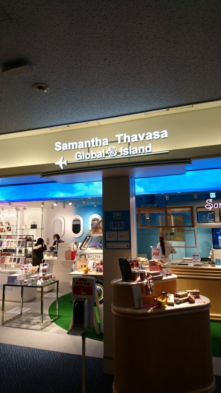 若い女性に人気のファッションブランドであるサマンサタバサの空港ショップ。この店は最近改装なってグローバルアイランド 羽田空港 第二ターミナル店となっていた。バッグ類などのファッショングッズ以外にスナック類のスタンドもあるユニークな店。