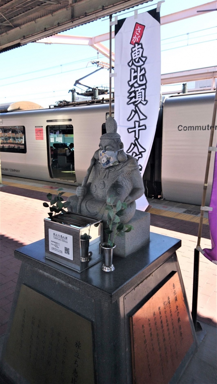 佐賀駅で降りたホームにこの旅立ち恵比須の像があった。その脇にさが恵比須八十八ヶ所巡りの幟がたっており、佐賀市は恵比須様巡りができるほど恵比須像が多いことに気がつかされた。一説によると市内に800体以上の恵比須像があるとのこと。