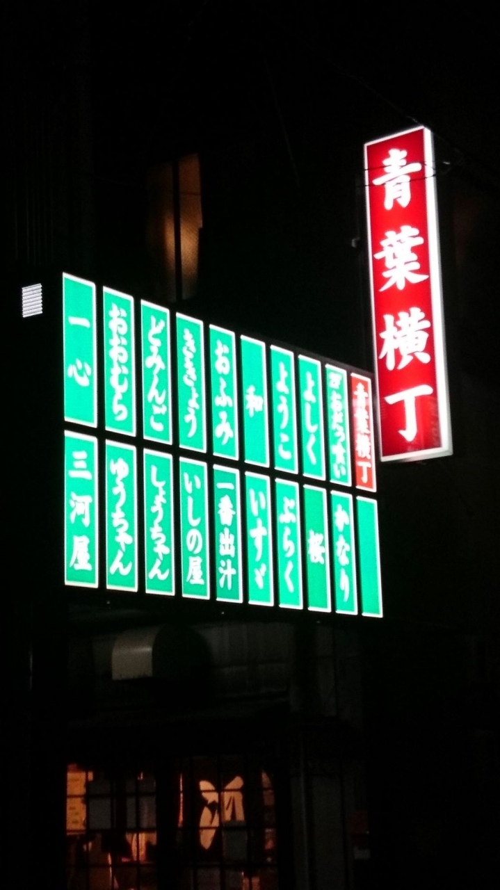 静岡市の中心部にある飲み屋街。静岡おでんの店を探して行きついた風情ある場所。入口にここの一角にあるお店の名前がでた看板は圧巻である。この中からどの店にするか正直迷ったが、いつも使うグルメサイトを参考にしてとりあえず選んだ。