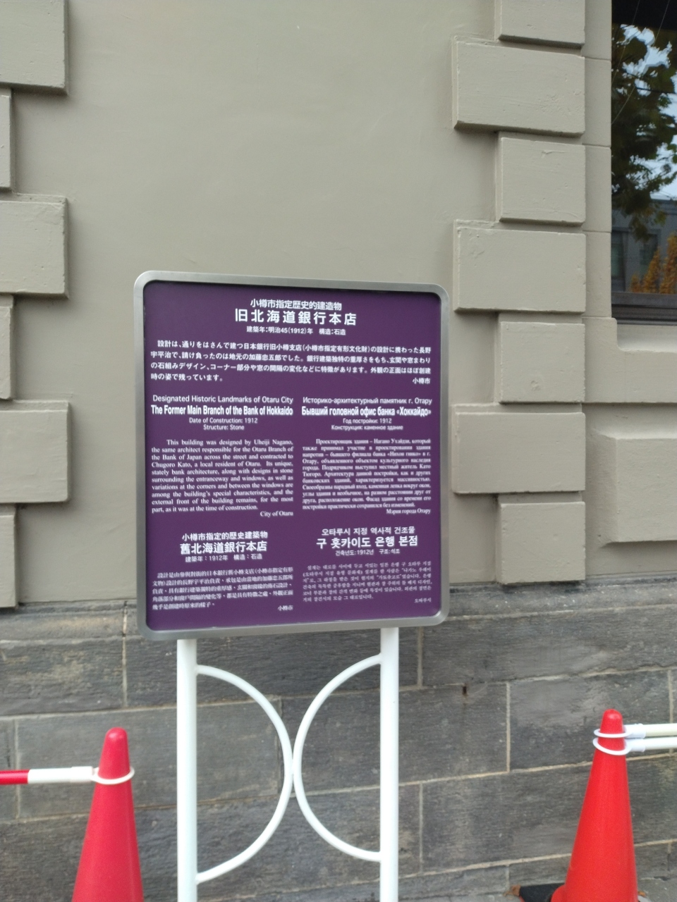 小樽は戦前は北海道経済の中心的な都市で、その名残がこの銀行の支店に代表される金融街である。特にここは近時国の重要文化財に指定されている、完成度の高い重厚な建築物。意外なことに、ここは小樽で最期まであった都市銀行の支店でもあったこと。