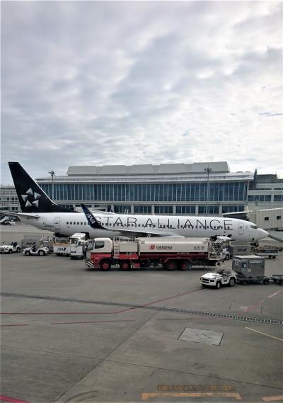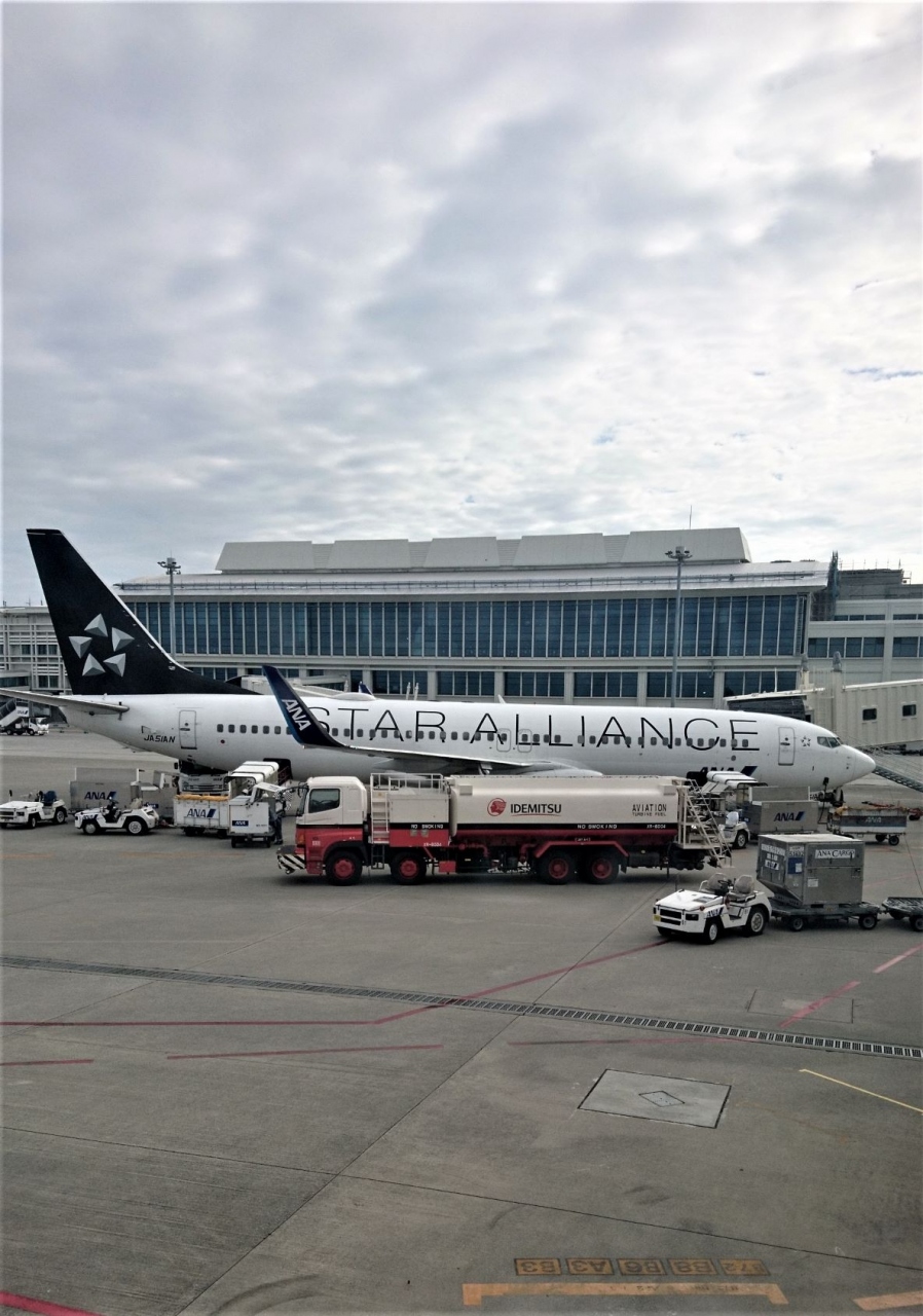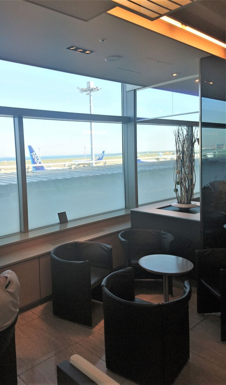 那覇空港のANAラウンジ。このラウンジはプレミアムスタイタス保持者やプレミアムシート利用者向け。泡盛が置いてあるのは沖縄らしい。見晴らしがよく、どこの席も電源コンセントが使えて便利。カラープリントが無料でできる。