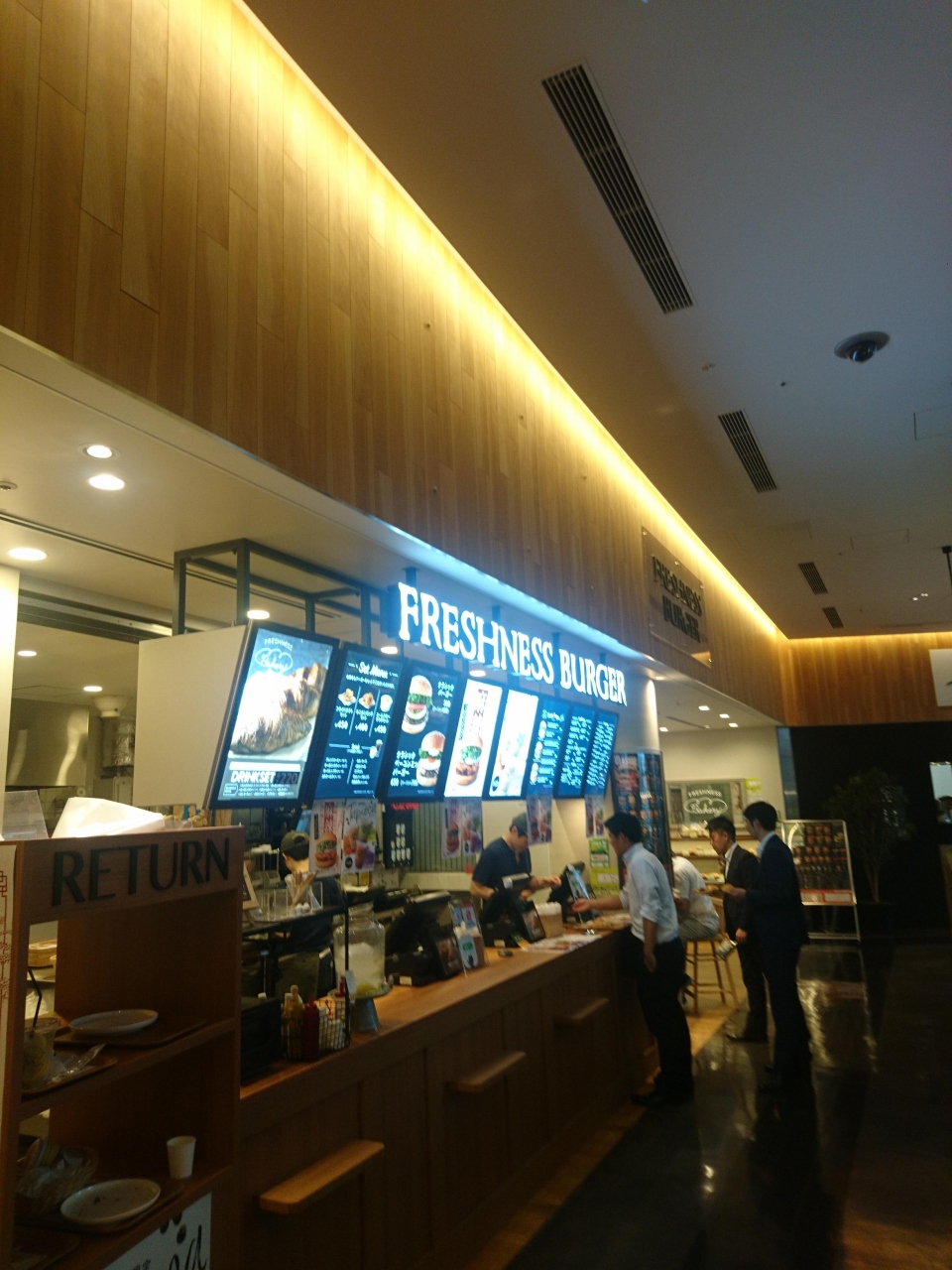 汐留の大型商業ビル汐留シティーセンターの1階にあるフードコート内にあるバーガーショップ。他のフレッシュネスバーガーとちょっと違うところは、奥のコーナーにパウンドケーキとかバーガー以外の食べ物も売っていること。