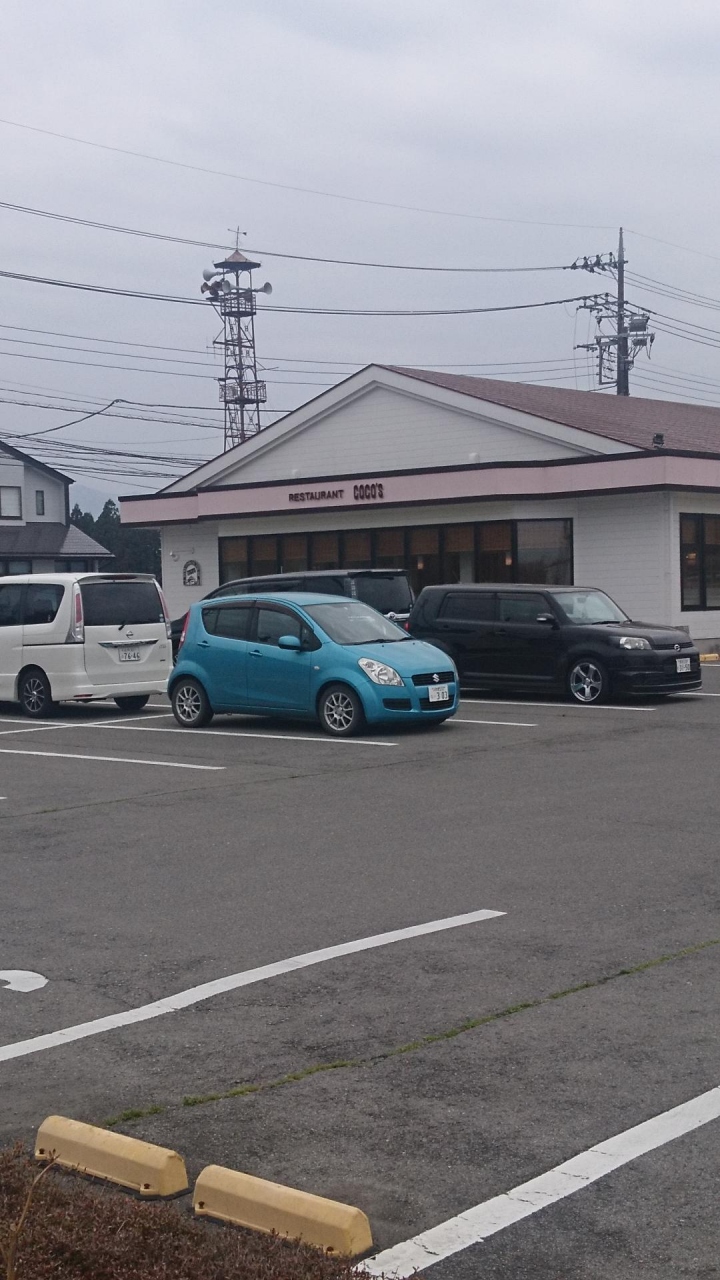 那須高原の主要道麓から湯本に向かう那須街道沿いにあるファミリーレストラン。ココスはどこでも黄色い看板が目印だが、この周辺は国立公園の風致地区のため黄色ではなく抑えたピンクがかったちょっと変わった色調の看板で戸惑う。