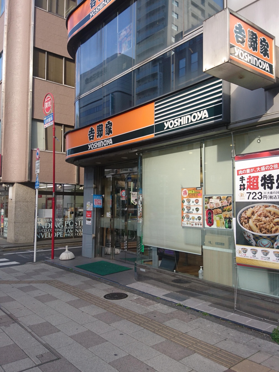 ここの吉野家は五反田駅を山手通り方向へ向かって歩いて目黒川を越えたあたりにある路面のお店。最近新登場の超大盛牛丼を食べてみるために利用した。超大盛は具が多いのでツユだくっぽくなるし、胃にもたれる。量的には頭の大盛り位が丁度いいと判明した。