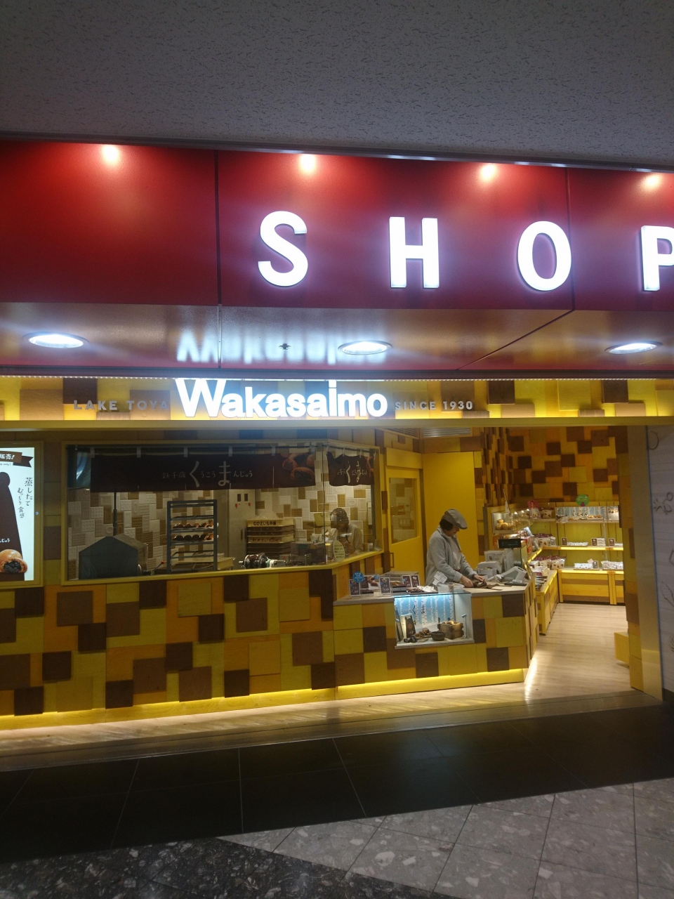 わかさいもは北海道の観光地洞爺湖の銘菓である。さつまいもがとれなかった北海道で焼きいもの味が味わえるお菓子として開発されたと聞く。今はなつかしい北海道出身のイラストレーターおおば比呂司さんの包装紙がまだ一部使われている。この店は千歳空港の直売店。