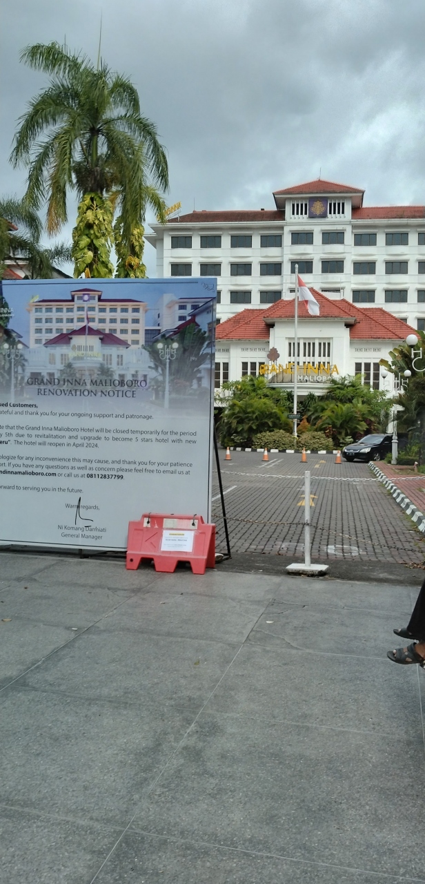 インドネシアの観光都市ジョグジャカルタの中心部のマリオボロ通りに面した、歴史あるホテル。便利な場所にあり、観光のついでに食事に行こうとしたが、残念ながら訪問した2023年1月は工事中で営業していなかった。