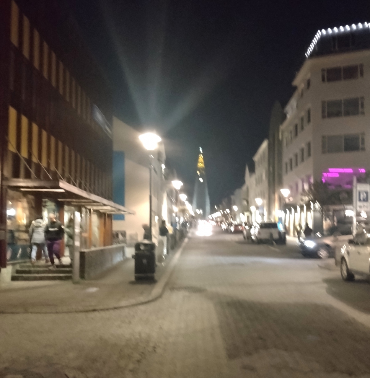 レイキャビク中心部のメインストリート。道の両サイドにはお洒落な物販店や飲食店が軒を連ねる。この道は、街のランドマークでもあるハットルグリムス教会方向に行く通りとクロスしていて、夜間も観光客中心に人通りが多い。