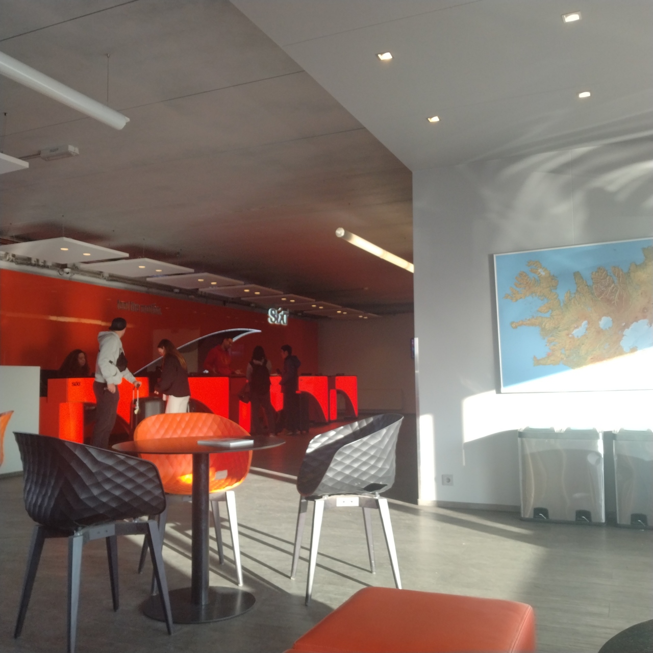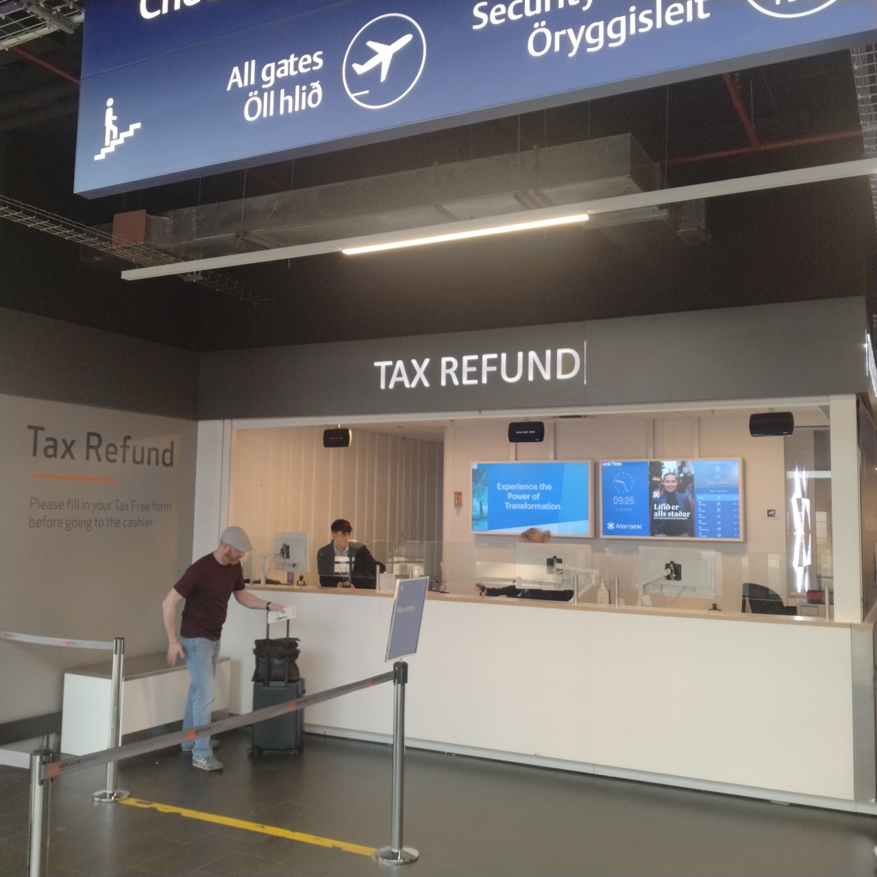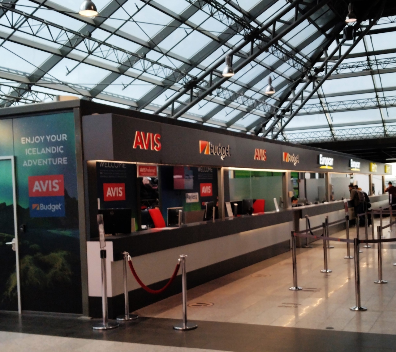 レイキャビクの国際線空港。市内中心部からバスで約1時間ほどの場所にある。施設はこの規模の空港としては機能的にできているが、色んな場所でスタッフが少なく、特に案内所はセキュリティーの巡回スタッフが兼務で機能不全だった。、