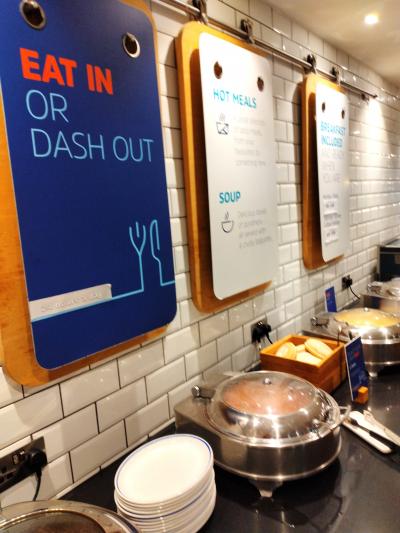 前回同じ系列のホリデイ イン エクスプレス ロンドン ヒースロー T5に泊まった際、ターミナル5とは相当に離れた場所にあり、シャトルバスもなく大きく失望したが、このホテルはターミナル4と連絡橋で直結していてすこぶる便利。おまけに同じIHG系ではワンランク上のブランドであるクラウンプラザとロビーや飲食は共用しており、サービスレベルが同じ。クラウンプラザと同じメニューの食事が、ホリデイ イン エクスプレス側にあるこのセルフサービスのレストランは安い。
