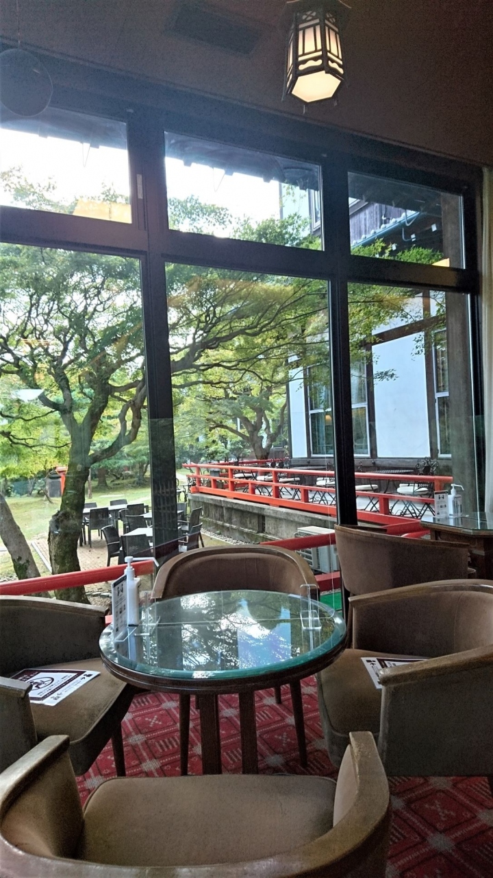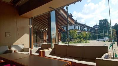 奈良ホテルの本館1階にある喫茶スペース。広いガラス窓があるテラス風の室内はからは、緑に包まれた庭園の眺めがすばらしい。繁みには隠れてなかなか見えずらいが遠くに興福寺五重塔も見える。飲み物や洋菓子の内容も秀逸。