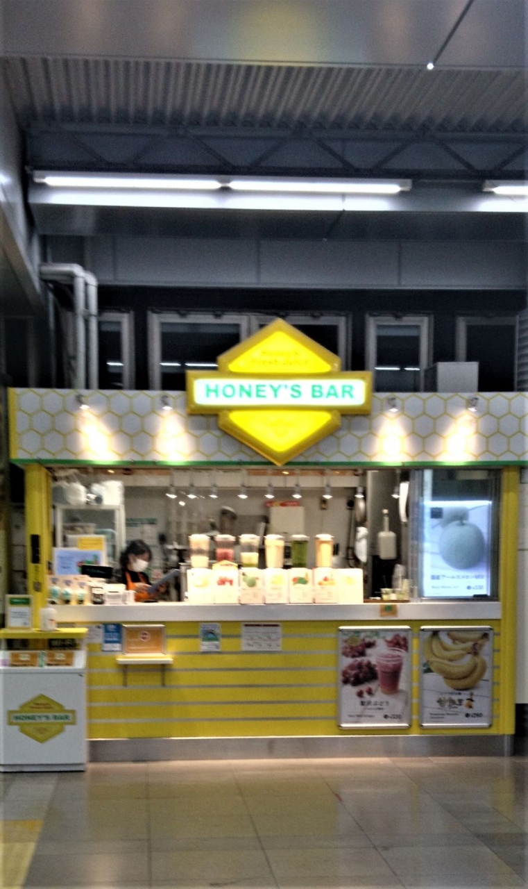 ハニーズバーはJR駅構内でよく見かけるジューススタンドチェーンである。ここは恵比寿駅東口のコンコース内にある店。暑い日にのどを潤すには健康面から生のジュースが最適である。そんな時にはこのスタンドの価値があがる。