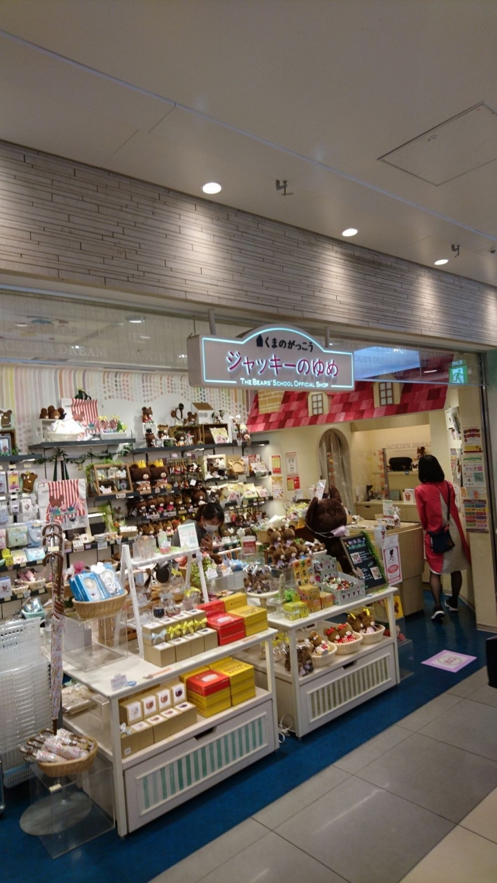 東京駅の商店街東京一番街の地下にはキャラクターストリートという各種のマスコットキャラクターのグッズショップが一堂に会するエリアがある。この店はくまのがっこうジャッキーのグッズショップ。縫いぐるみは勿論お菓子なども販売している。