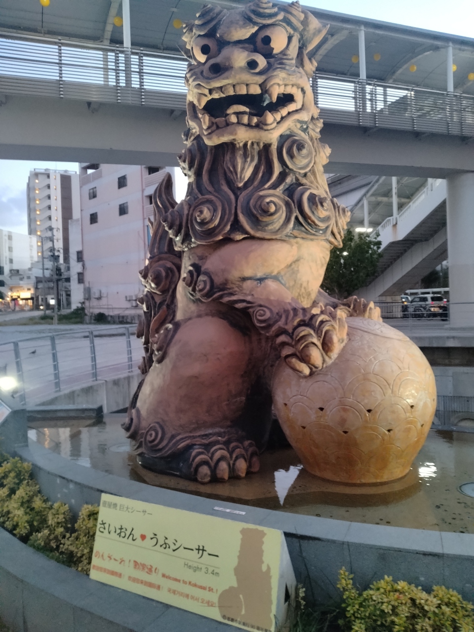 ゆいレールの牧志駅に近い「さいおんスクエア」前にあるシーサー。シーサーとは沖縄の方言で「獅子」を意味し、エジプトのスフィンクスに由来する言われています。魔除けの役割を持つ守護神として沖縄の各家庭に置かれています。これくらい大きなものはなかなかないので那覇観光の記念写真の名所になっていました、、