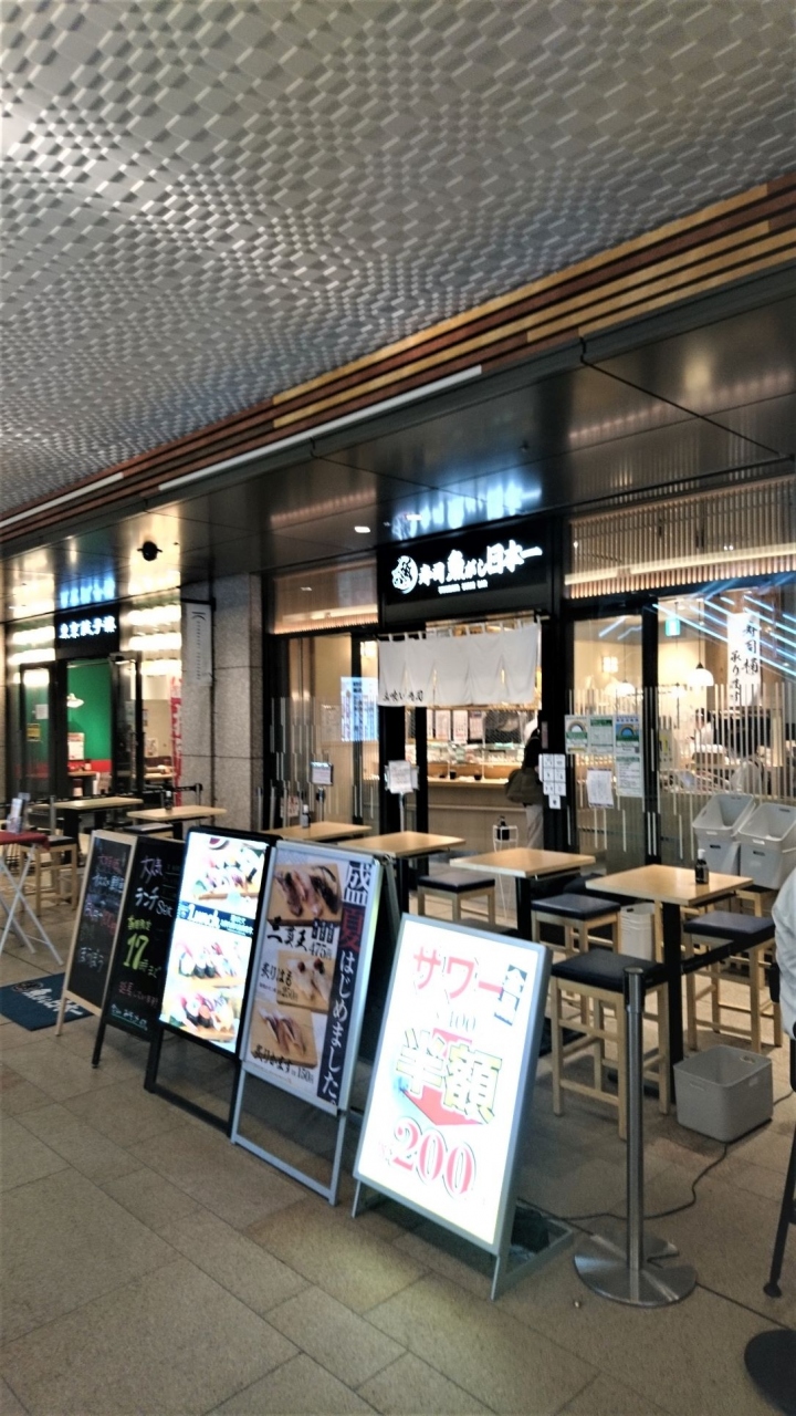 魚がし日本一は回転寿司とは一味違う立ち食い寿司のチェーン店である。手軽な値段で回転寿司で味わえない本科的な江戸前寿司を楽しめる。ここエドグランのレストラン街にあるお店は、店の前にテラス席風なスツール&テーブル席がある。
