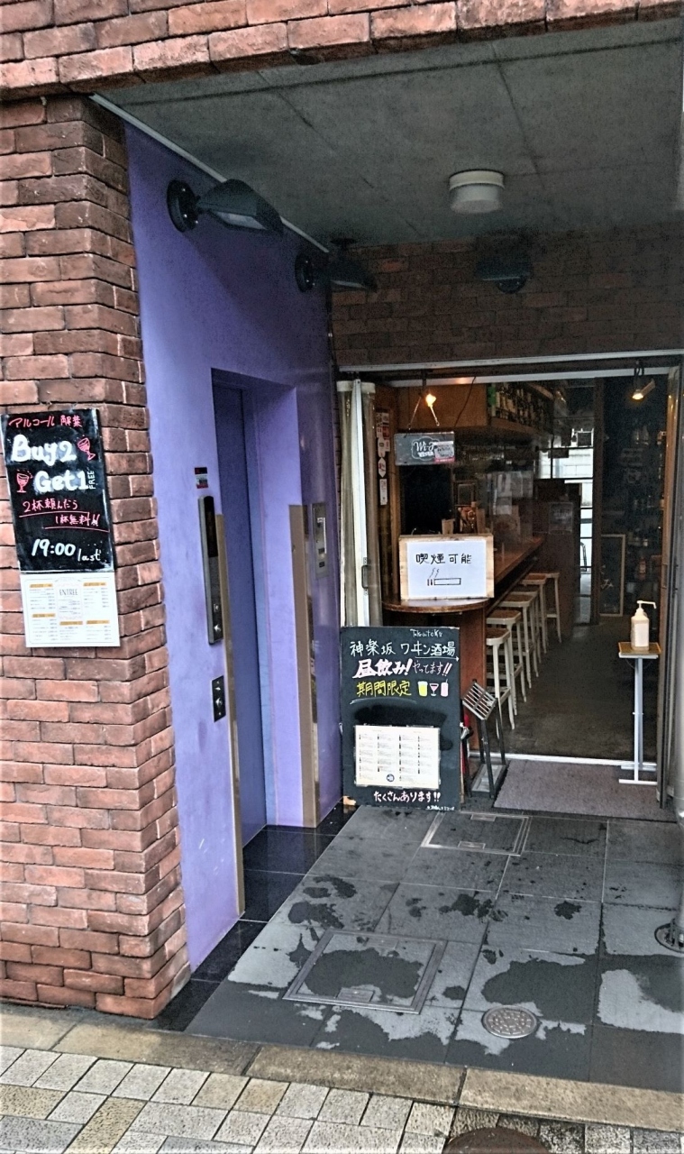 神楽坂のメインストリート神楽坂中央通りの真ん中あたりにあるワインバー。緊急事態宣言が解けたので、昼飲みもできる店としてちょい飲みにも利用できる店。店頭に店内での喫煙可能の表示があったのが利用した最大の動機。
