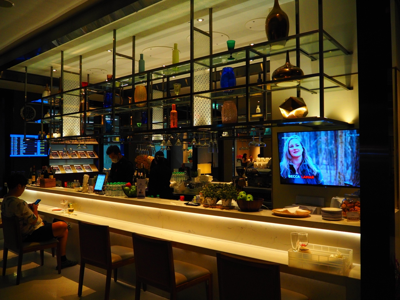 人気があるので、夕方以降出発便が集中する時間帯になるといっぱいになりますので座るところを探すのが大変な場合があると思います。ラウンジはバーカウンターを中心にレイアウトされていて、それほど広いわけではありません。また、23時に閉まりますので深夜便の乗り継ぎ時の利用には注意が必要です。尚、シャワースペースはありません。