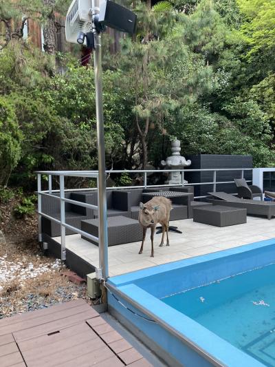宮島で宿泊するのに利用しました。お宿にある温泉は、一度建物の外に出てからプールの横を通り、階段を登ります。広くはありません。熱いお湯でしたが気持ちよかったです。プールには、鹿が遊びに来てくれました。お宿は比較的綺麗でゆっくりと過ごせました。バイキングの夕食付きにしましたが、利用者が少なく、たくさん美味しくいただくことができました。