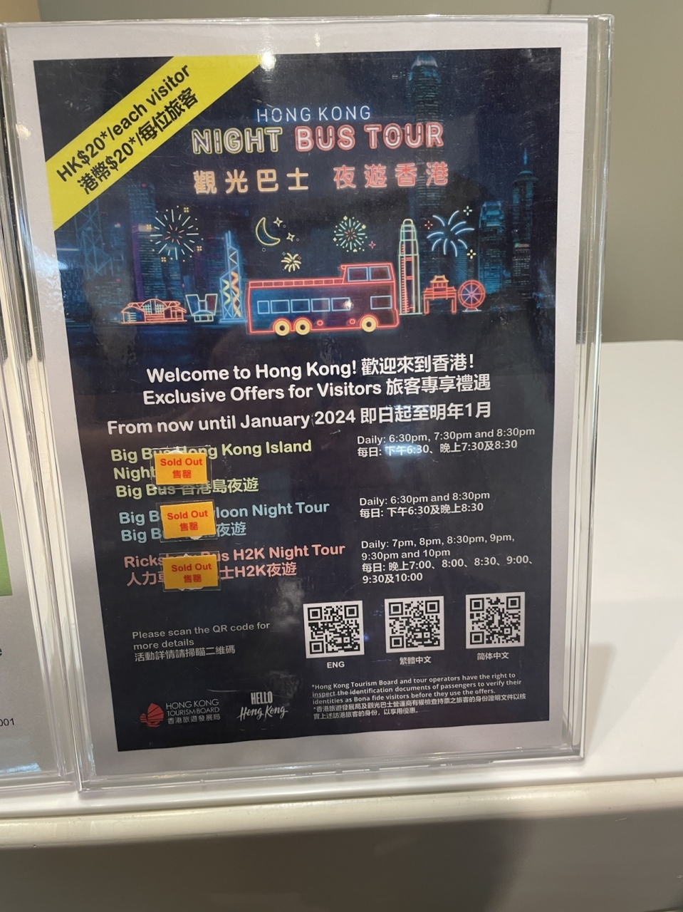 今回、香港の企画にて安価にて利用できるオープントップバスのツアー予約をしに訪問しました。残念ながらオープントップバスのツアーは満席で予約できませんでしたが、丁寧に近場の観光をする場所や、レストランを教えていただきました。丁寧に対応してくださりありがとうございます。