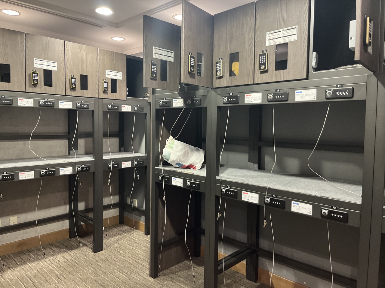 フロントでの荷物預かりは、目の届く所にロッカー形式の荷物預かりや、ワイヤー錠が設置されており、その部屋には防犯カメラもあって利便性が高かったです。