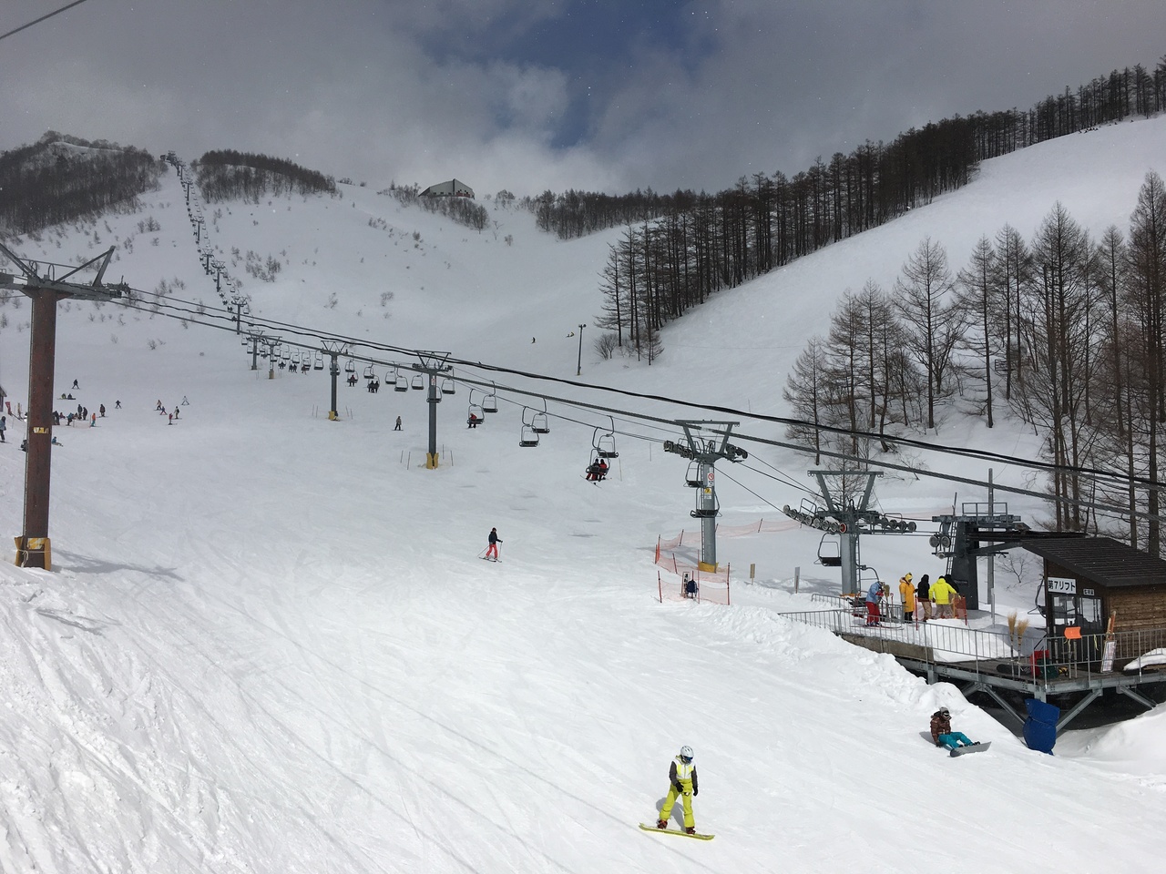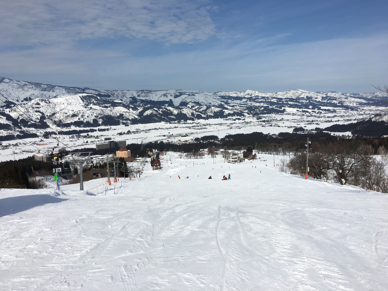 ベースから比較的長い初級者コースはペアリフト一本。その上は、中級者以上のコースが多く、見た感じ急な斜面が見えますが、一本上がった尾根の方が、雪質も良く、斜度もゆるいのでオススメです。頂上は1800m以上あり景色も良く、コースも幅広でした。