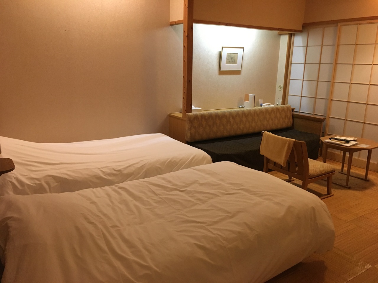 温泉倶楽部のツインルームに泊まりましたが、建物自体はやや年季が入っていますがお客さんが触れる部分は綺麗にリニューアルされていました。- 旅行時期