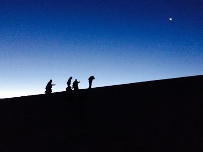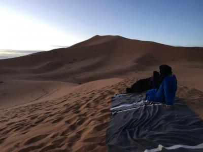ホテルヤスミナからラクダで20分あまり。メルズーガ大砂丘に登って見ました。朝日はイマイチでしたが、夜明けから陽が昇るまでのひと時を過ごす事ができました。