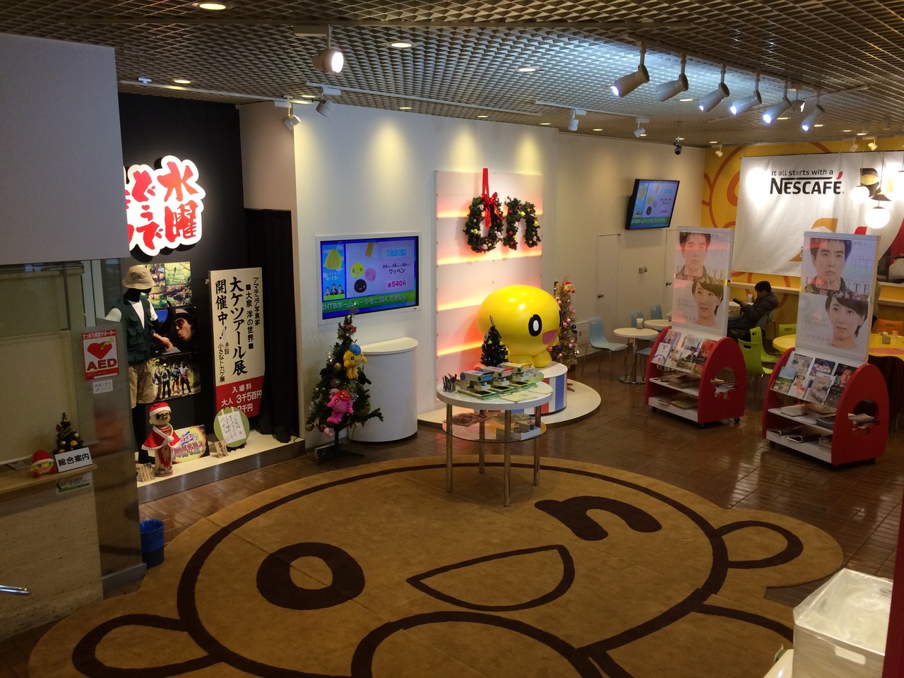 社屋の1階ロビーは誰でも見学可能で、HTB売り出し中の番組のポスターやチラシの配布や水曜どうでしょうの衣装などの展示があります。どうでしょうグッズの自動販売機や、カフェコーナーもありますので少しお金を落として行きましょう。