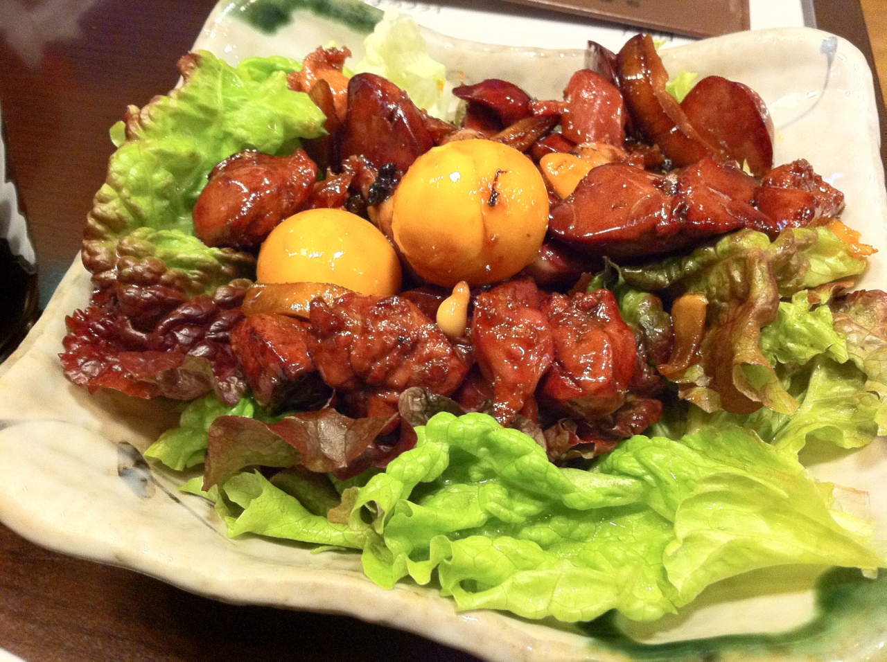 甘辛いたれと、新鮮な鳥もつ、少し焦げたような香りが食欲をそそります。