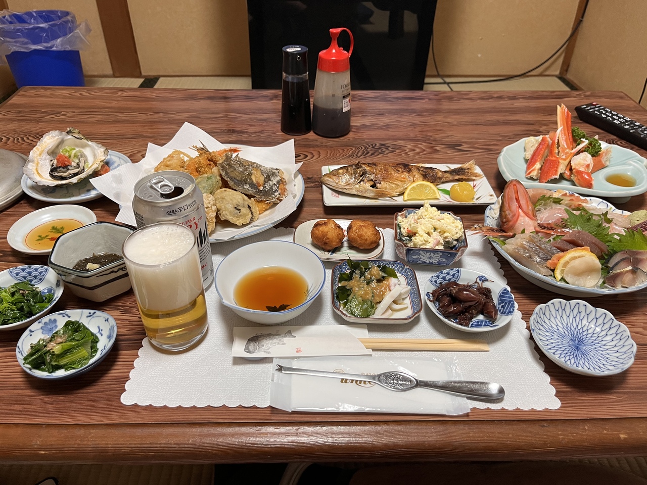 割烹のような手の込んだ料理というよりは、田舎のおばあちゃん家で仕出を取ってみんなで食事するような感じです。特に朝晩のサラダがおいしかったです。お刺身やズワイガニは期待ほどではありませんでしたが、岩牡蠣や、のどぐろは新鮮で美味しかったです。- 旅行時期