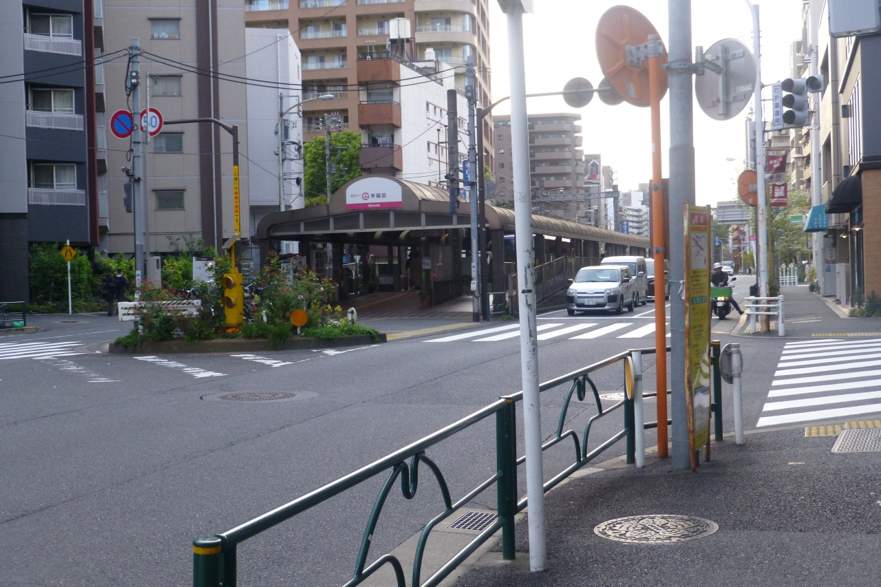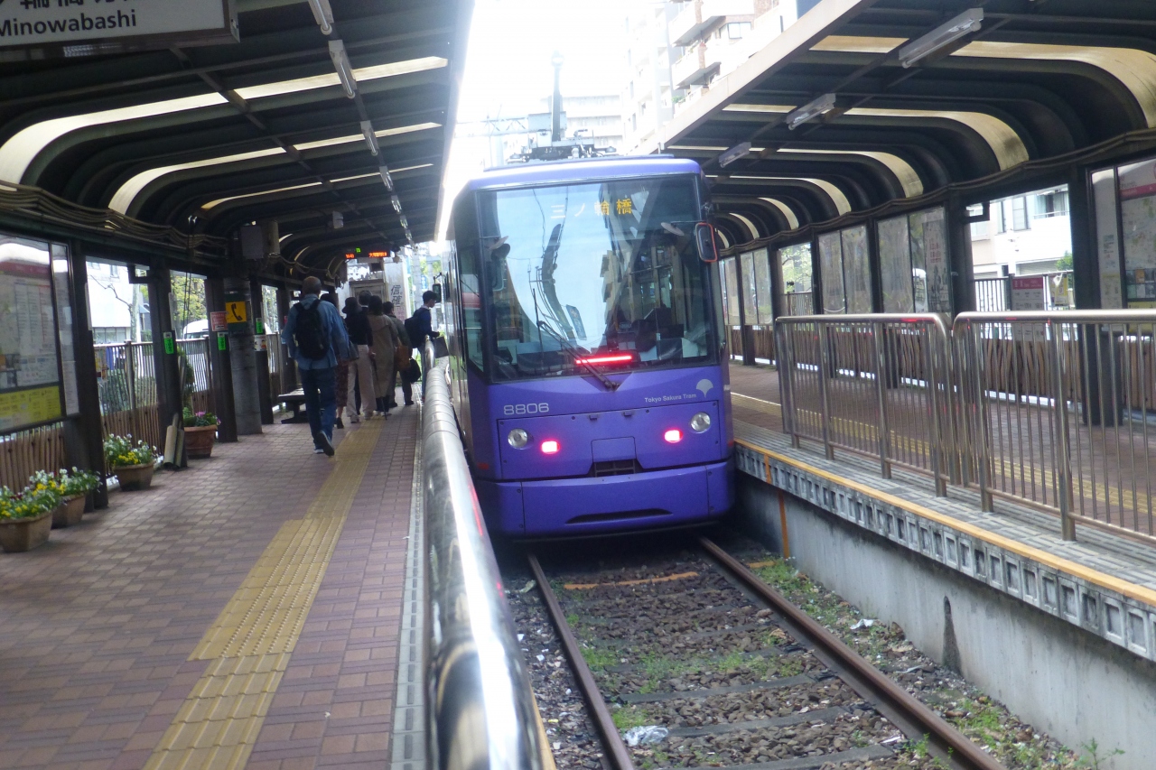 椿山荘利用時春の陽気に誘われて静かな通りを路面電車の駅まで歩きました。緩い坂を下りながら大通りへ向かい、前方にはっきりとわかる駅の屋根が見えます。当たり前ですが、ホームへ渡る階段もなくバリアフリーの究極の乗り物だと痛感します。全線170円。ワンマンカー。特に目的なくアトラクション感覚で乗るのも楽しい「チンチン電車」駅
