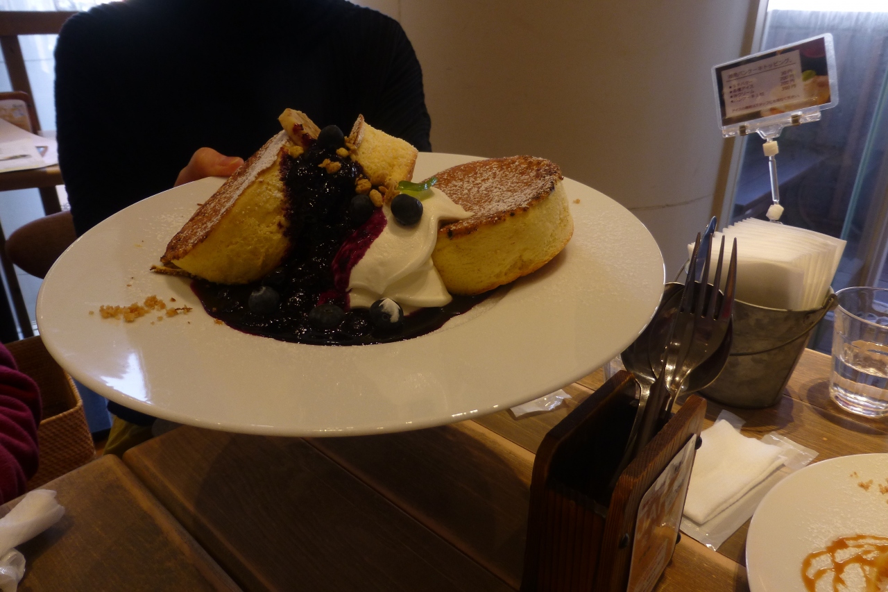 噂とおりの厚焼きパンケーキはふわふわで美味しく、友人3人と行きそれぞれお別物をオーダーしましたが、トッピングの違いだけのように感じました。パンケーキ以外にもランチやディナーのための食事がのってました。
