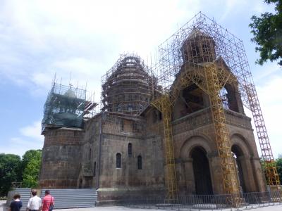エレバン市内から路線バスで向かいました。終点ではなかったのですが、乗り合わせた地元の方々が皆親切に降りるところを気に掛けてくれて問題なく到着。広大な敷地に建つ大聖堂は遠くからみても分かるほどに修復のための足場がくまれていました。中には入れませんでしたが周囲、扉や壁の美しい彫り物をみるだけでも素晴らしく感動しました。居合わせた方がまた、親切に色々と説明してくれました。アルメニアの人達は人なつこく親切です。