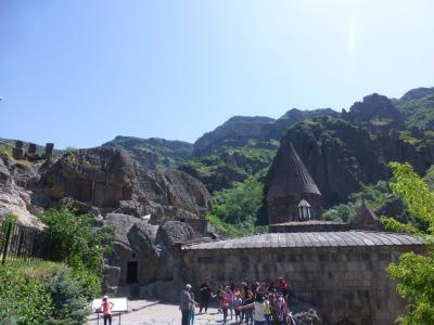 エレバン市内からガルニ神殿とゲハルト修道院を組み合わせて個人手配したタクシーで往復しました。ガルニ神殿から更に渓谷を上り6キロ、岩山の中に美し聖堂のとんがりやねが見えてきます。しかしこれは戸外にある聖堂で、始まりの光景でしかありません。岩山をくりぬいてつくられた教会が圧倒的な存在感でこの場所にあります。大きな教会の他に岩の横肌には個人での僧窟も並びます。素晴らしい世界遺産です。