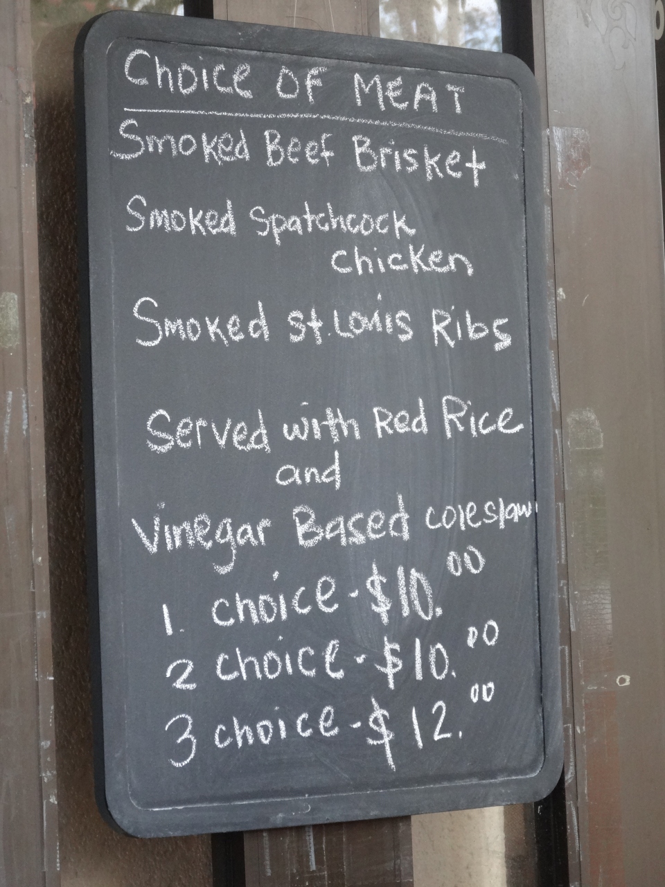 看板メニューはスモークしたビーフ、ビーフ・ブリスケッタ。