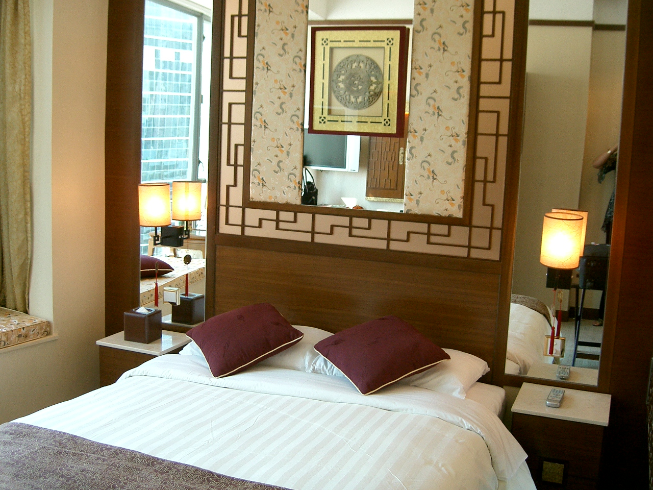 スィートの範疇に入るのでしょうか、部屋はとても広く、3つのパートに分かれていて、ドア->水周り->ベッドルーム->居間->テラスと続いてました。居間には2.5人掛け&1人掛けX2+テーブルのソファーセットと大きな書き物机が置けてまだ余裕がある感じです。ベッドもキングサイズ。スリッパはふかふか。
