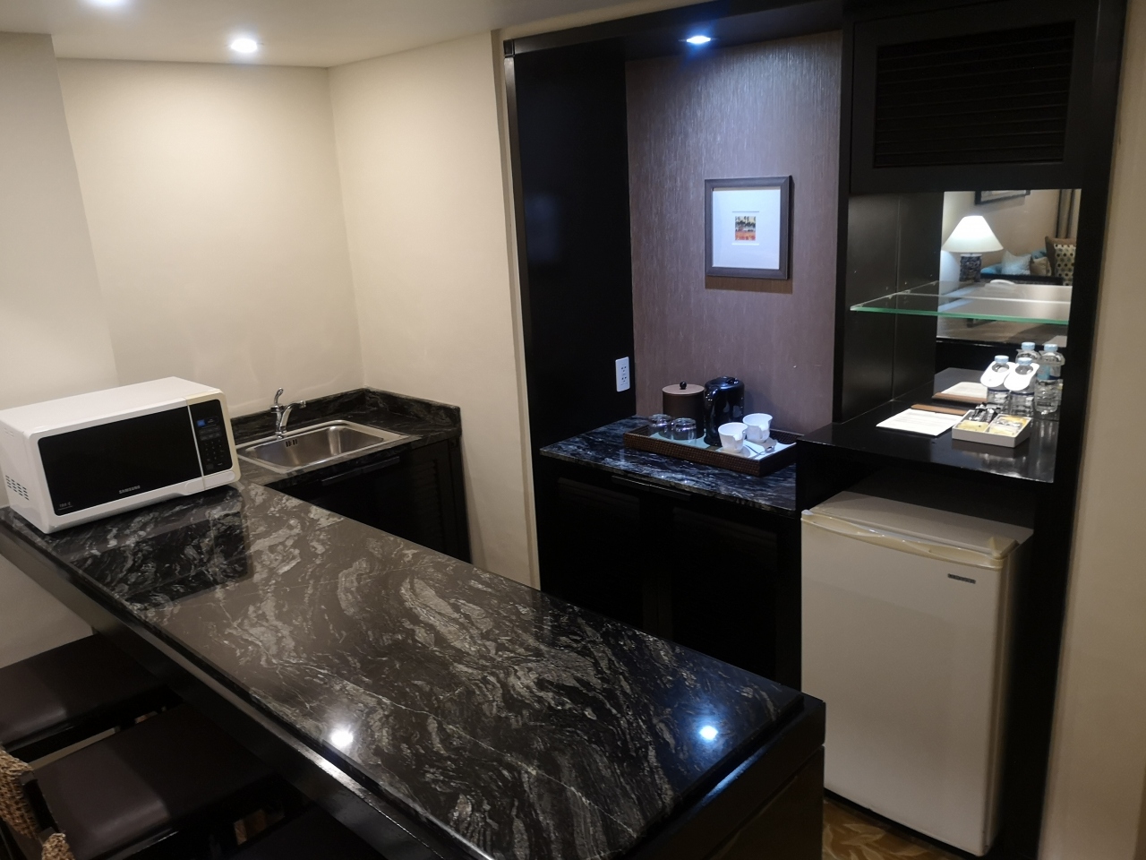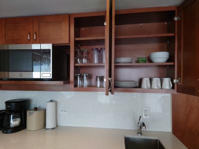コンドミニアムタイプのホテルなので食事は付きませんが、キッチンや調理器具、電子レンジがついているのでテイクアウトしたものを部屋で皿に取り分けて食べたり温めなおして食べることができます。
