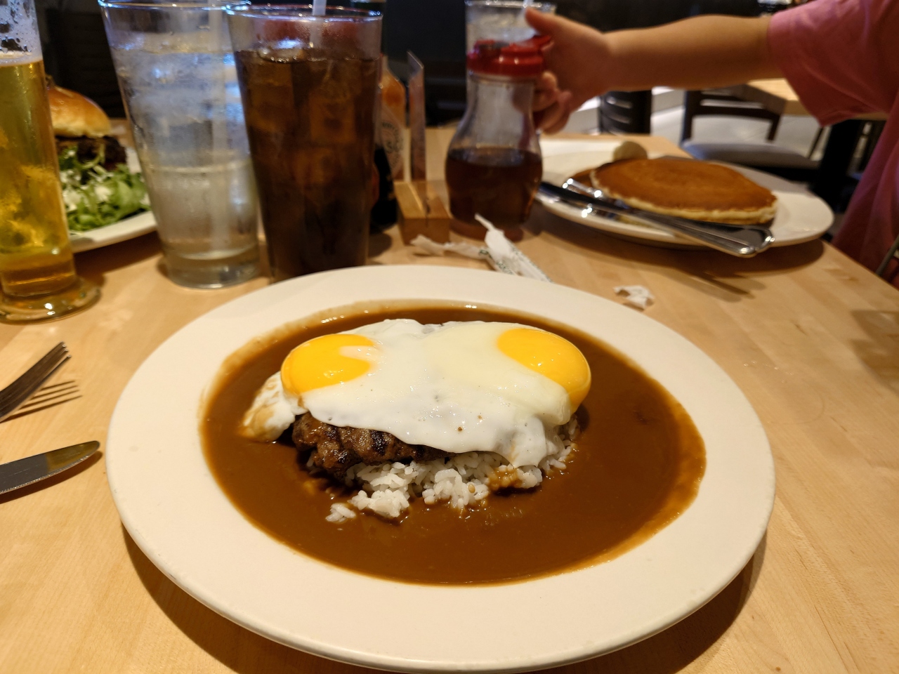 ソースたっぷりのロコモコ、大きなパンケーキ、どれもとてもおいしかったです。