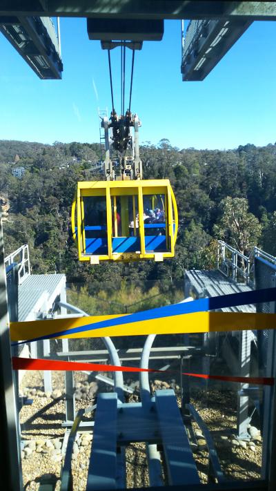 スリーシスターズをエコーポイントから見た後、歩いてシーニックワールドへと徒歩コースで向かいました。徒歩で30分ぐらいかかりましたが、途中途中に写真撮影向けスポットがあってブルーマウンテンを満喫できます。そして、スカイウェイ乗り場が見えてきます。ただ、行列があって2回スカイウェイをお見送り。そのおかげで、一番に乗車。意外とあっという間に向こう岸に到着。カトゥーンバフォールズを見ることができました。