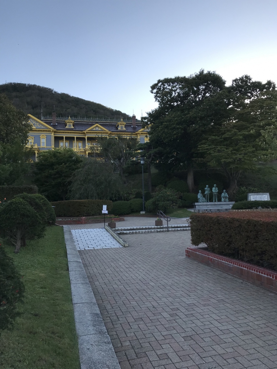 教会が多い元町公園の中に薄水色と黄色が基調の宮殿のような建物がありひと際目立ちます