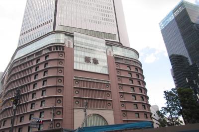 阪急百貨店の茶色い建物の上に近代的なビルが突き出た形の外観になっています