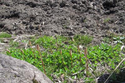 4月の田んぼのカエルの卵や雪がまだ残っている様子