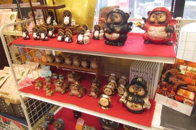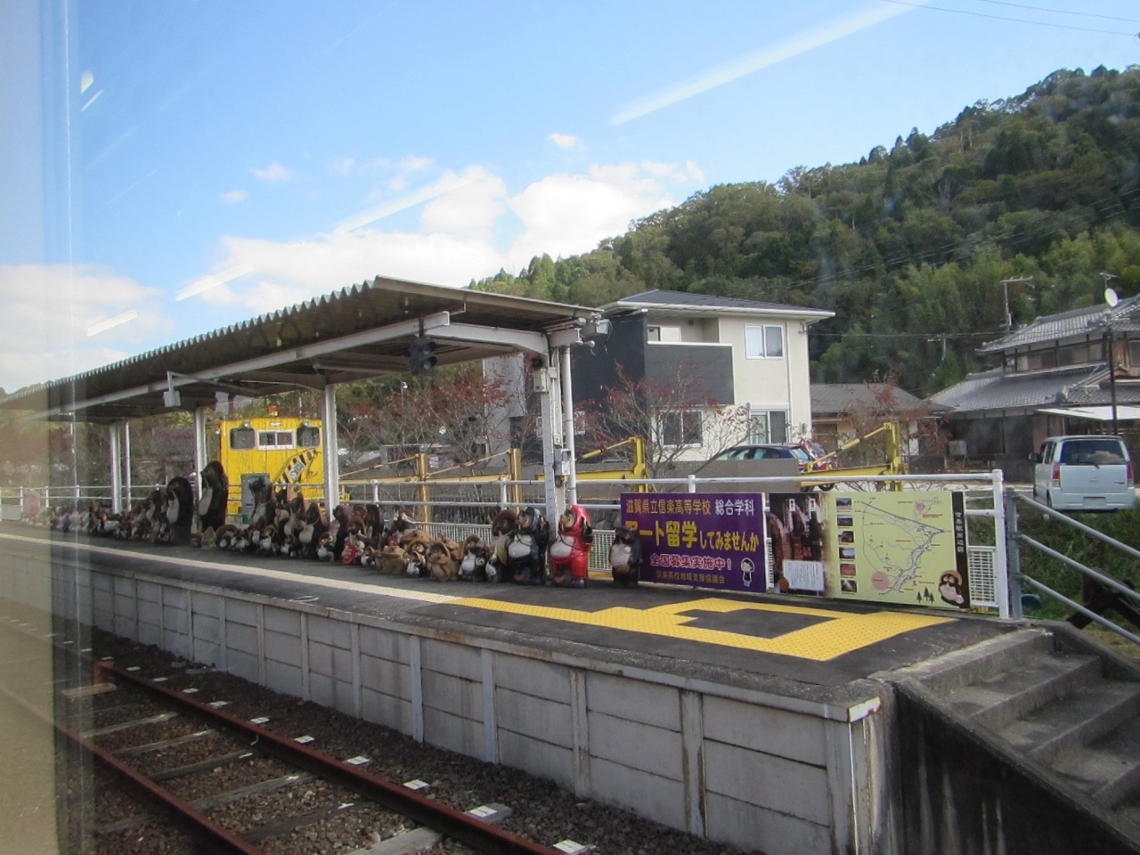 駅ホームに横並びにずっとたぬきが並んでいるので