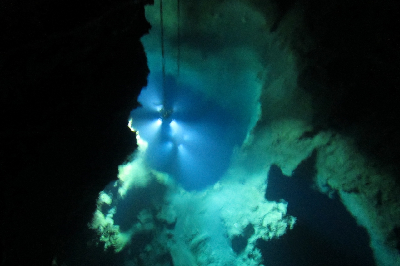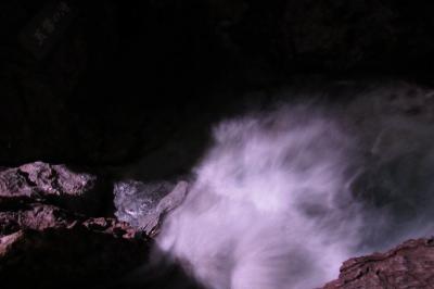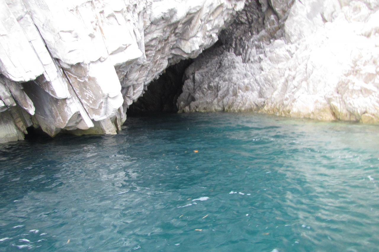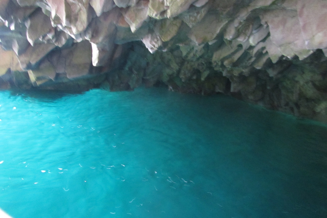 洞窟に入って後ろを振り返るとエメラルドやコバルトブルーに輝く海