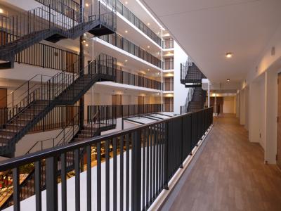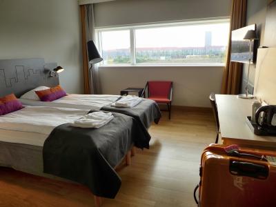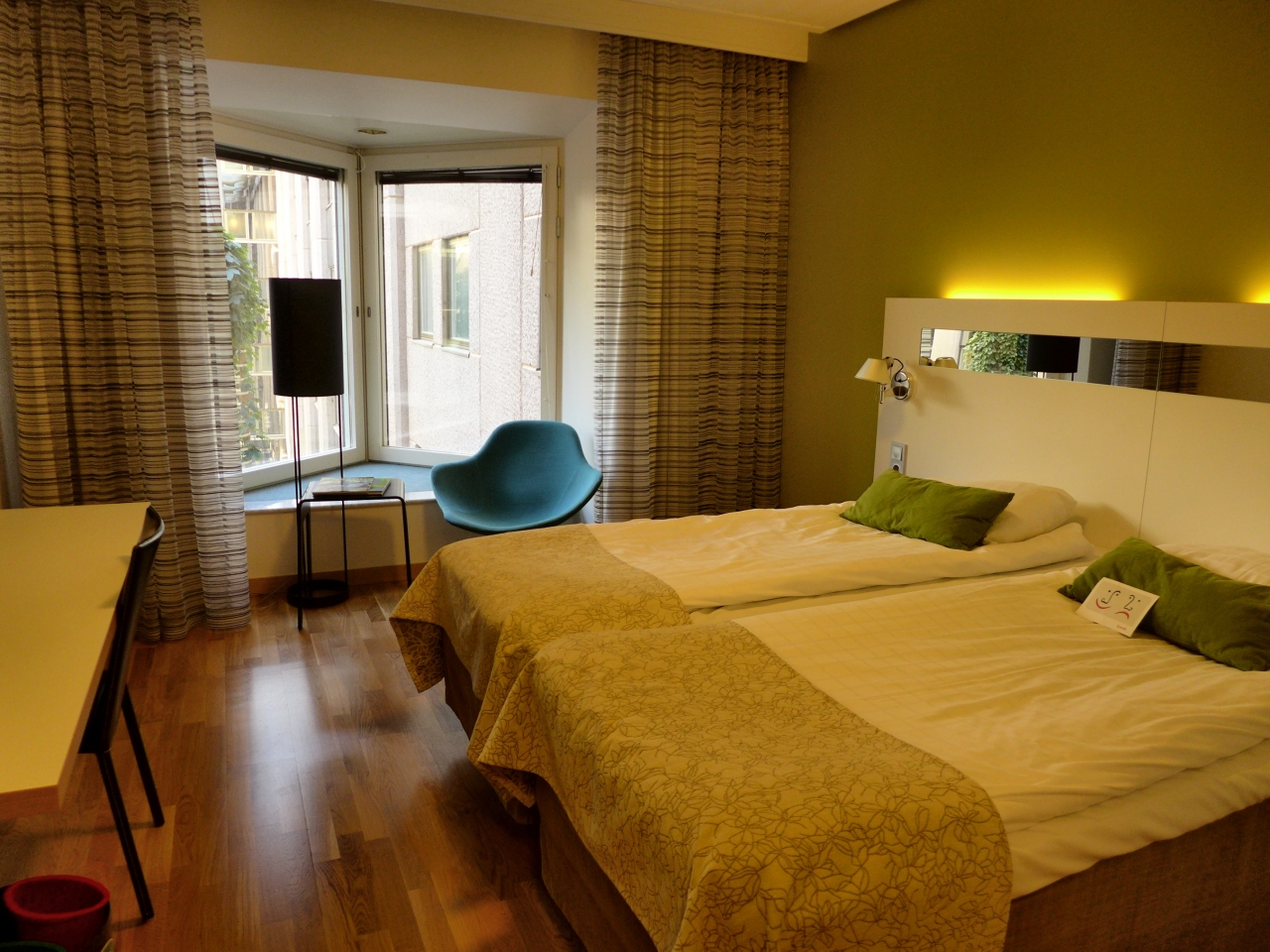 北欧らしい家具が置かれてきれいな部屋で、部屋の窓からは吹き抜けの中庭が見えて素敵でした。