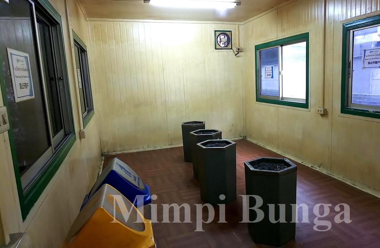 以前、ターミナル1と2の間のタクシー乗り場の前(2階)のコンビニ前にて暗黙の了解だった場所のすぐ下(1階)、市内へのバス乗り場の道を渡った場所にある、エアコン完備の喫煙所なら、ゆっくりと一服できます。