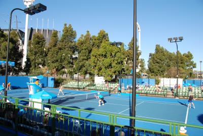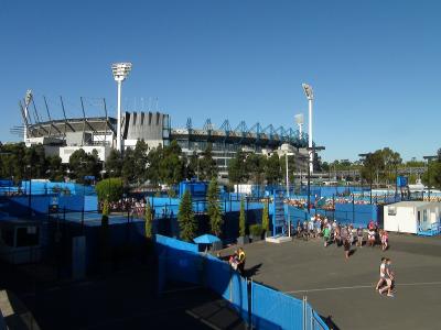 夜8時を過ぎても明るいこの時期のメルボルン、仕事を揚げてからも十分に間に合いました。全豪オープンでの象徴的な青い色のハードコートが印象的でした。ロッドレーバーアリーナからハイセンスコートまでを歩き、GoundというA$30の一番安チケットでしたので有名選手はみられませんでしたが、男女のダブル2回戦を見ました。