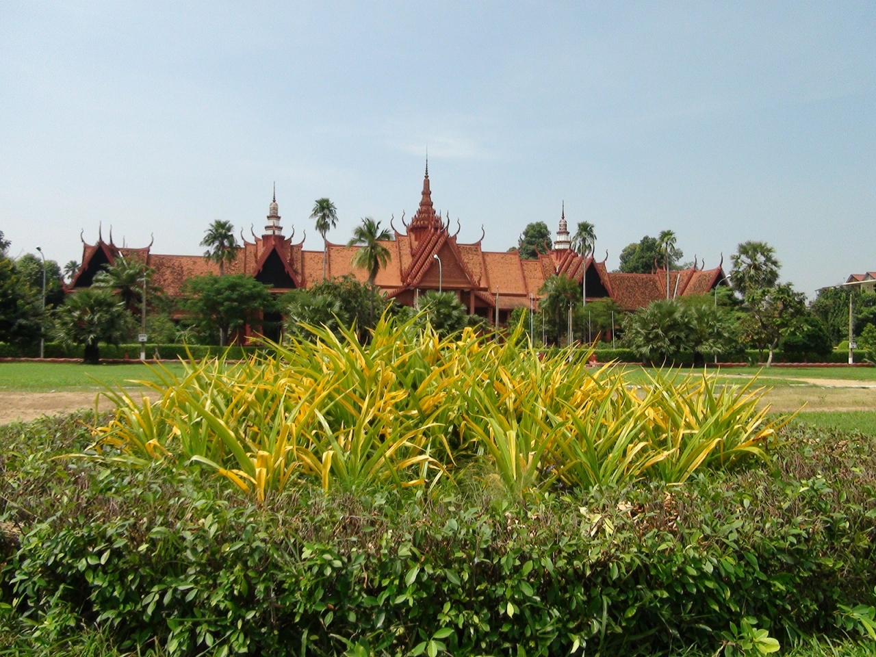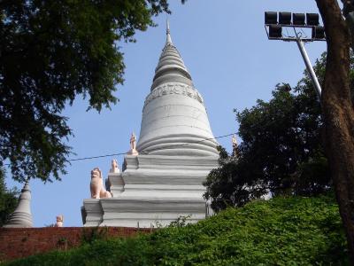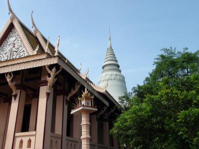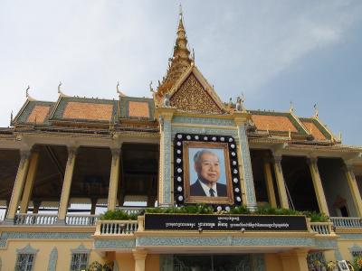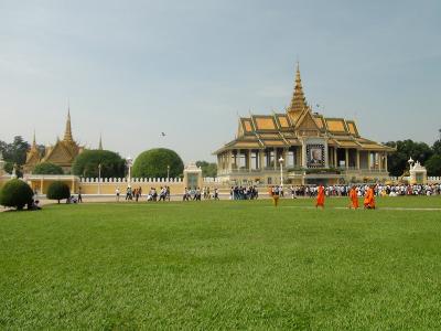 ちょうどトンレサップ河とメコン川が交わる地点を向こう岸に見るところに王宮はあります。広い芝生とクメール王朝風の建物がこの国が平和を取り戻したことを象徴しているかのようでした。ちょうどシアヌーク前国王が逝去され、喪章を胸に付けた国民が大勢集まっていました。普段の日は入場が午前11時までと午後2時からなのでお昼時の訪問に注意が必要です。
