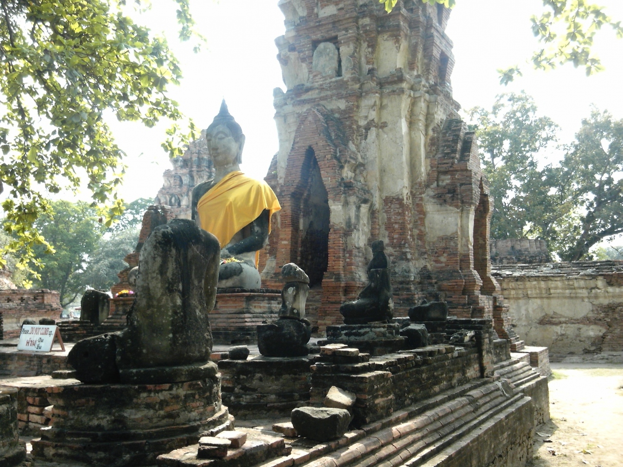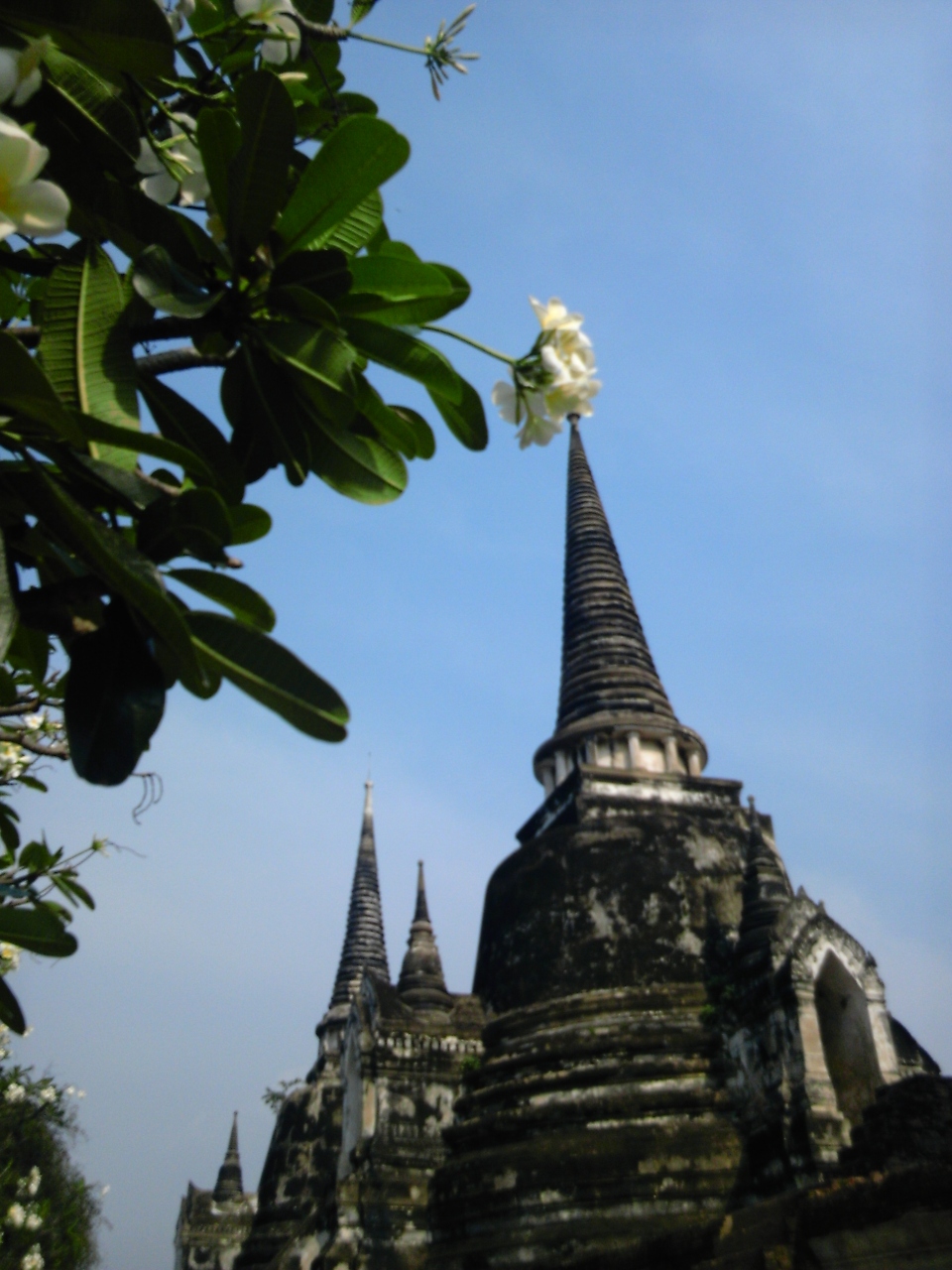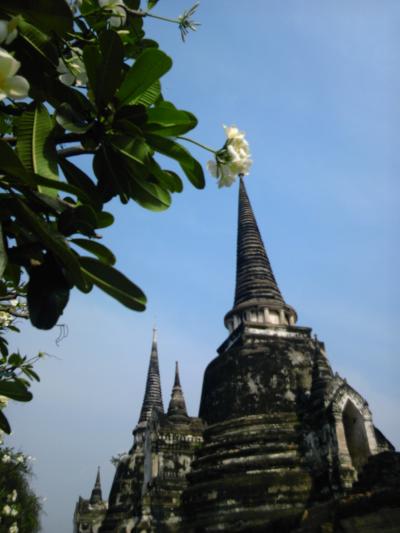 広々とした敷地内にアユタヤが栄華を誇った当時の最大の寺が威容を放っています。特に3つのパゴダが一列に並んでいる様子はアユタヤの観光ポスターなどにもよくつかわれているシンボリックな風景です。ちょうどプルメリヤの白い花が咲いていて、灰色となった廃墟とのコントラストを描いています。時間をかけてゆっくりと見て歩きたい世界遺産の一角です。