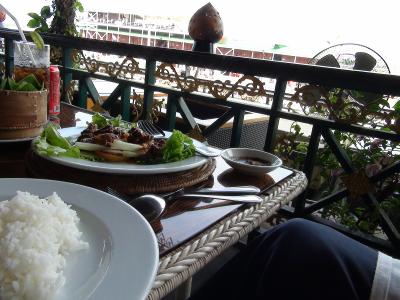 船の形をしているレストランで、丁度ホーチミンへ向かう船着き場のすぐそばにあるレストランです。クメール料理をはじめとしてイタリアンやフレンチも提供しています。我々は昼食に訪れ、牛肉を中心としたクメール料理をシェアして食べました。飲み物のコーラを入れてもUS$10しませんでした。