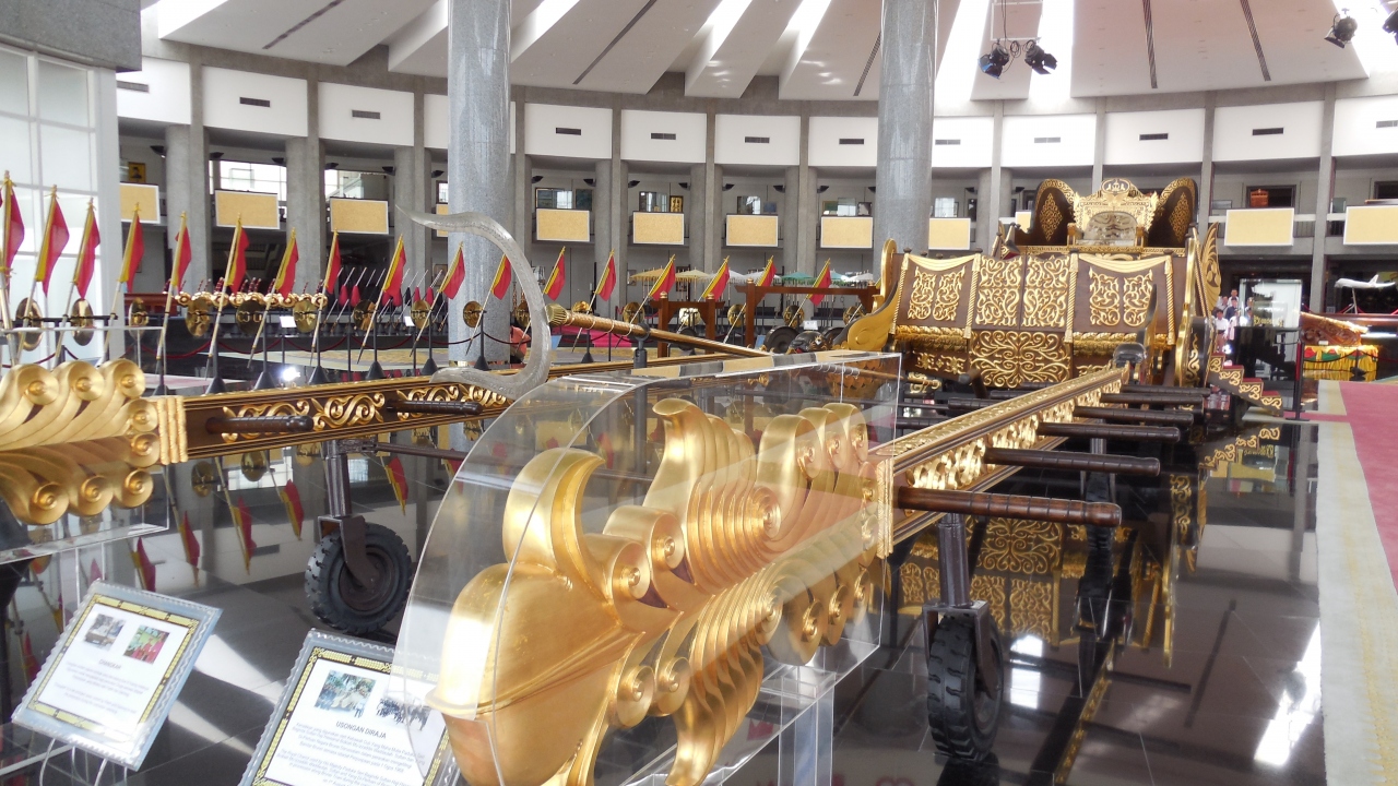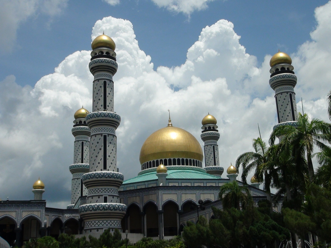 バスセンターからB$1の循環バスに乗ってモスクのすぐ前に到着。広大な敷地に金箔のよう目立つ尖塔がとても印象的だ。熱帯らしい青空と空高く届く入道雲をバック氏にしたその姿は神々しい。まさに金持ちの王様の国のモスクだけあって風格がある。